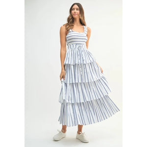 The pin stripe smocked bodice layered midi dress combines classic pinstripes with a trendy smocked bodice for a stylish and flattering look. The tiered design adds volume and movement to the dress, creating a fun and dynamic silhouette. Perfect for a variety of occasions, this midi dress offers a blend of sophistication and comfort for a chic and modern ensemble.