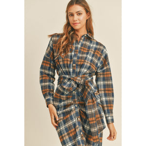 This shirt dress features a classic plaid flannel pattern in a versatile and stylish design. With a front tie detail, it adds a touch of femininity and flair to the overall look. The button-down style makes it easy to wear and adjust for comfort. This piece can be dressed up or down, making it perfect for various occasions. The plaid pattern adds a timeless and charming aesthetic to the dress. Overall, this shirt dress is a versatile and chic addition to any wardrobe.