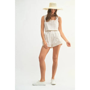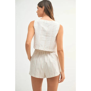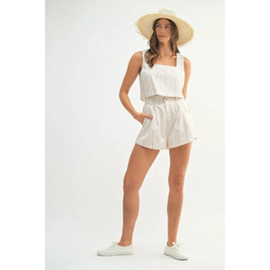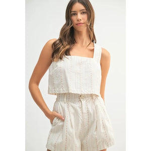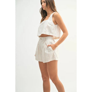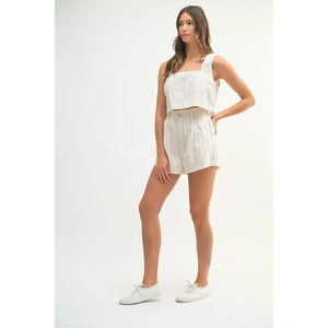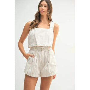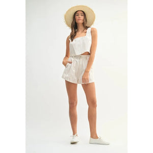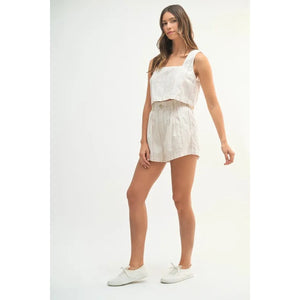 This set showcases a stylish square neck crop top paired with matching shorts. The square neck design adds a modern and flattering touch to the top, while the coordinating shorts create a chic and cohesive look. Perfect for a trendy and coordinated outfit that is versatile and perfect for a variety of occasions.