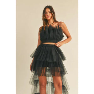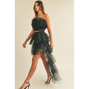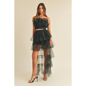 MABLE Tulle Tube Ruffle Crop Top and High Low Maxi Skirt Set