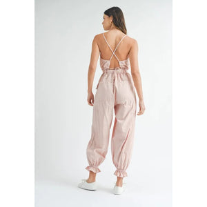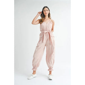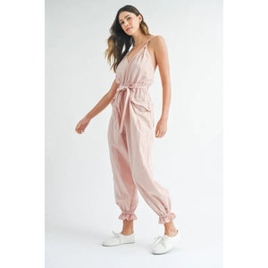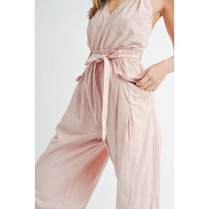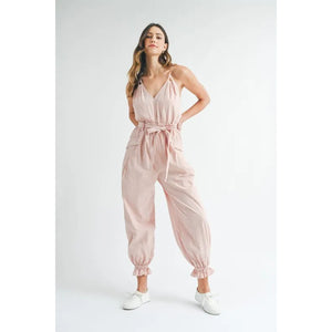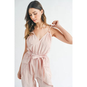 MABLE Washed Fabric Spaghetti Strap Waist Belted Jumpsuit