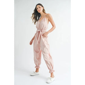 A washed fabric spaghetti strap waist belted jumpsuit is a trendy and versatile addition to your wardrobe. The washed fabric gives it a laid-back and casual vibe, while the waist belt adds a touch of structure and definition. Perfect for a variety of occasions, this jumpsuit can be dressed up with heels or dressed down with sandals for a stylish look. Enjoy the comfort and fashion-forward style of this chic jumpsuit!