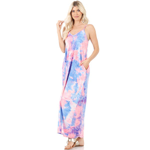 NEW! French Terry Tie Dye V-Neck Cami Maxi Dress with Pockets Dresses