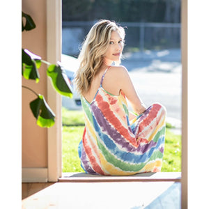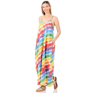 French Terry Tie Dye V-Neck Cami Maxi Dress with Pockets - Rainbow Stripes