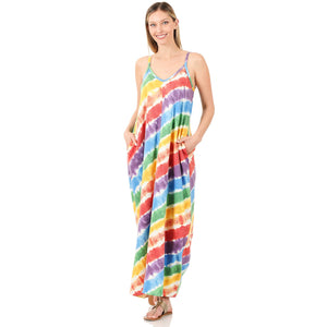 NEW! French Terry Tie Dye V-Neck Cami Maxi Dress with Pockets - Rainbow Stripes