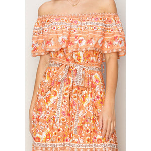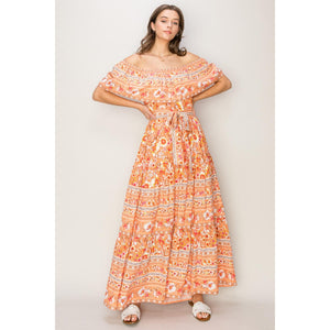 The Floral Off-Shoulder Tie Front Maxi Dress is a stunning and elegant choice for any special occasion. The off-shoulder design adds a touch of romance and sophistication to the look. With a tie front detail, this dress flatters your figure and creates a stylish silhouette. The floral print adds a playful and feminine touch to the overall design. The maxi length of the dress is perfect for formal events or summer soirees. Made from high-quality and flowy fabric, this dress ensures both comfort and style. Make a statement in this gorgeous floral off-shoulder maxi dress and turn heads wherever you go!