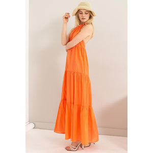 This cotton voile dress features a tie-back halter neck and a loose-fit tiered maxi silhouette, making it ideal for warm days or tropical getaways. The open-back design adds a carefree vibe to the overall look.