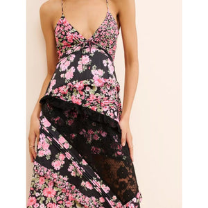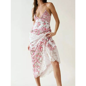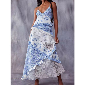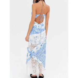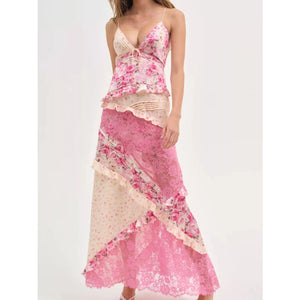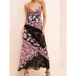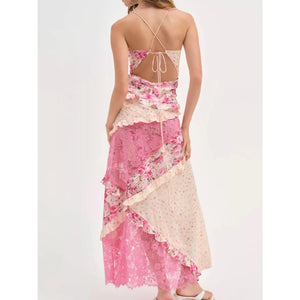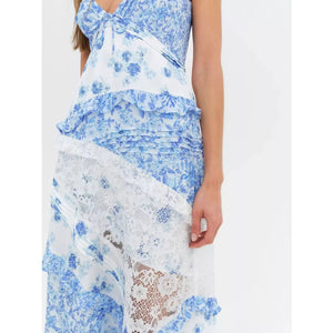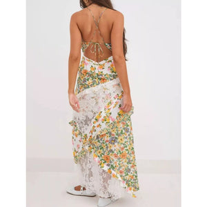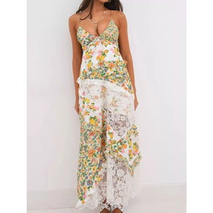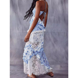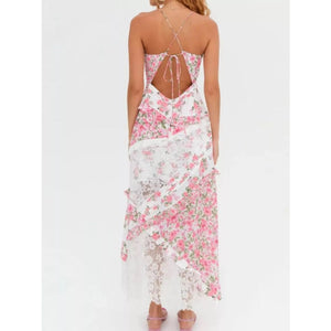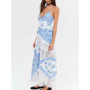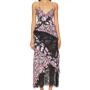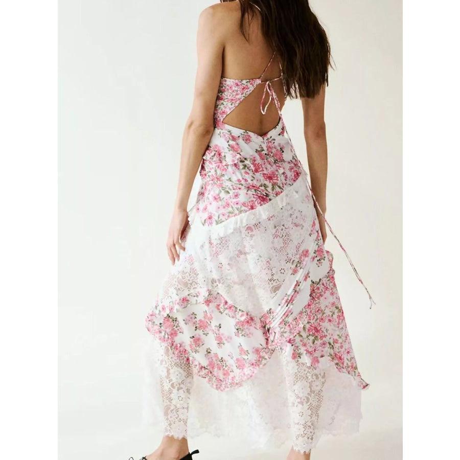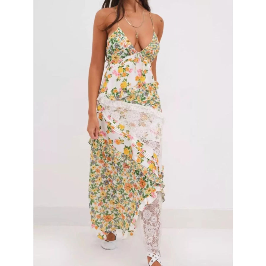 Lace Detail Ruffled Floral V-Neck Maxi Dress