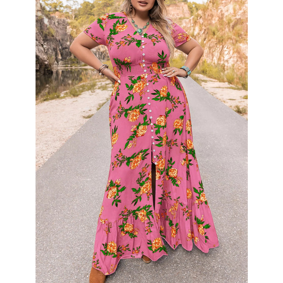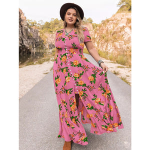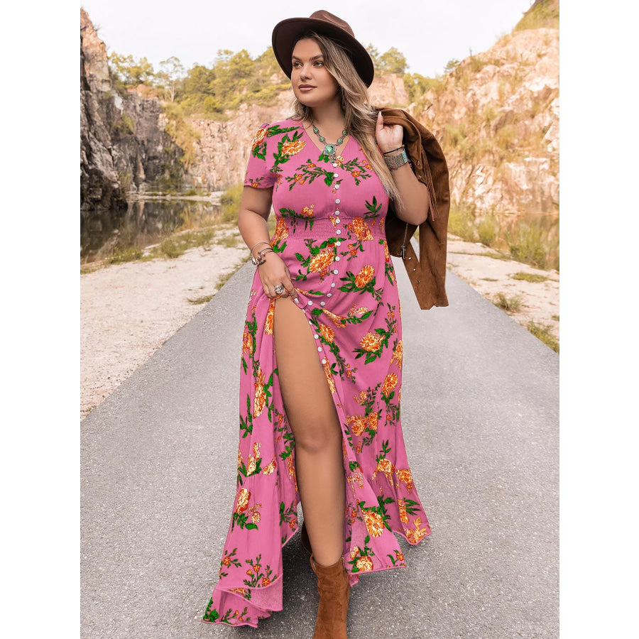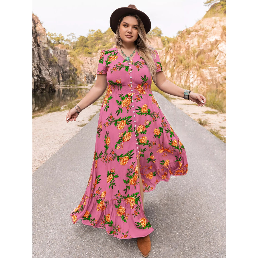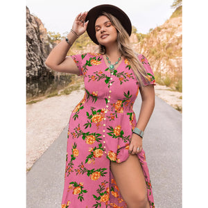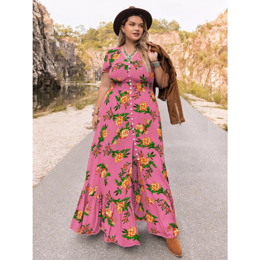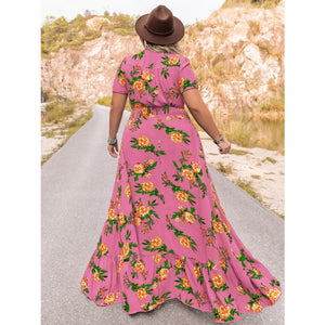 Plus Size Floral V-Neck Short Sleeve Maxi Dress