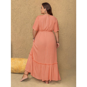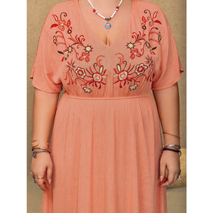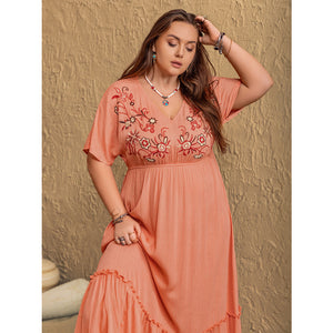 Plus Size Frill Embroidered V-Neck Half Sleeve Maxi Dress