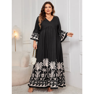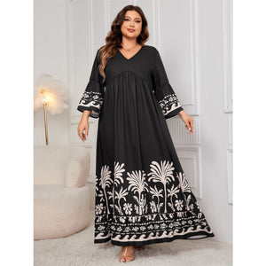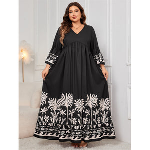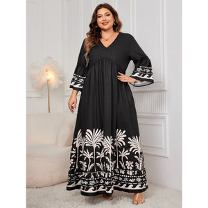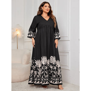 Plus Size Printed V-Neck Long Sleeve Maxi Dress