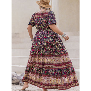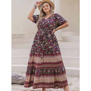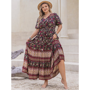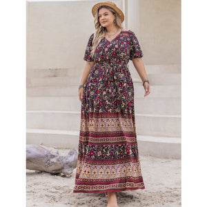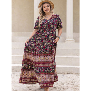 Plus Size Printed V-Neck Short Sleeve Maxi Dress