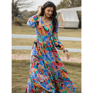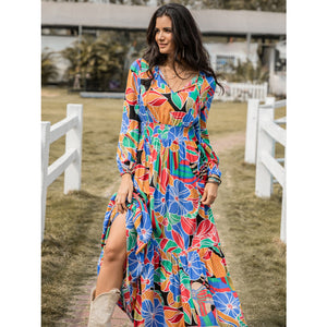 Printed Smocked Tie Neck Balloon Sleeve Maxi Dress