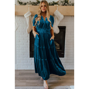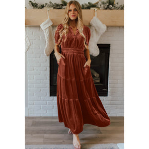 Red Dahlia Velvet Short Sleeve Shirred Waist Tiered Maxi Dress