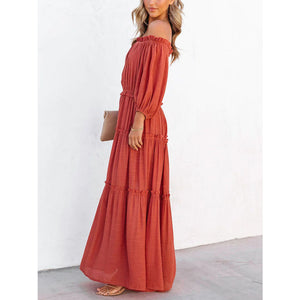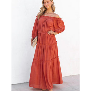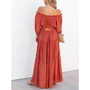 Ruffle Trim Off Shoulder Long Sleeve Maxi Dress