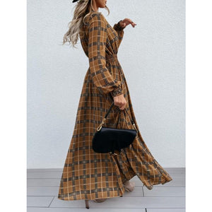 Slit Plaid Tie Neck Long Sleeve Maxi Dress