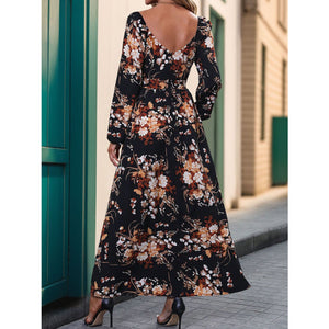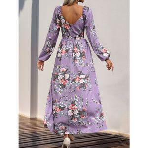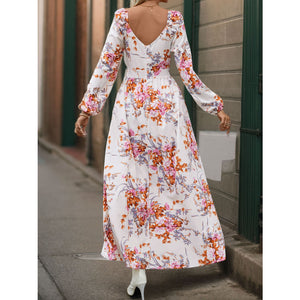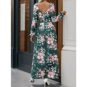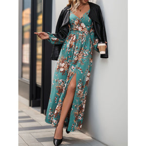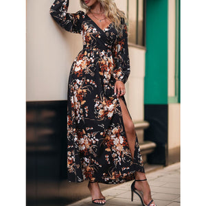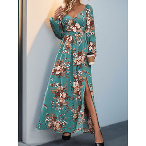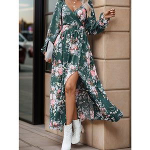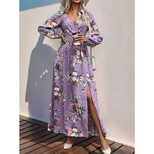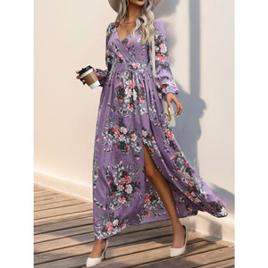 Slit Printed Surplice Long Sleeve Maxi Dress
