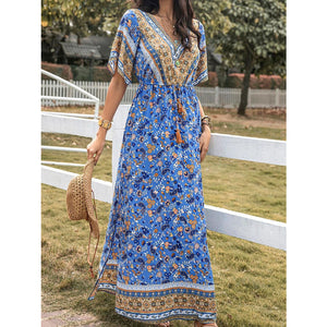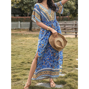 Slit Printed V-Neck Half Sleeve Maxi Dress