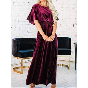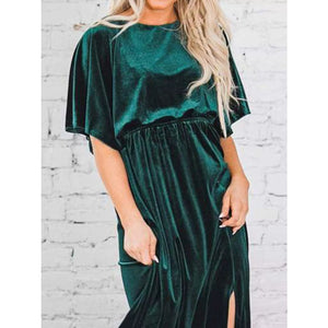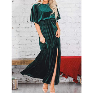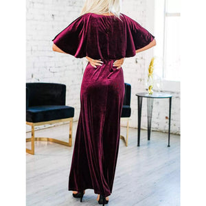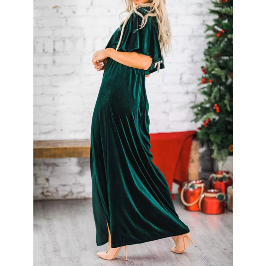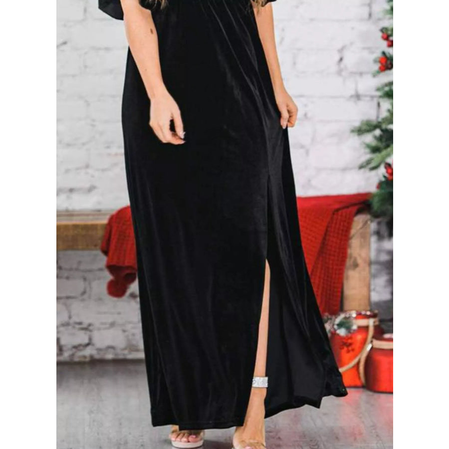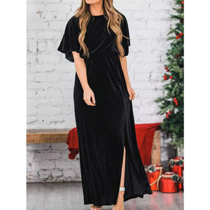 Slit Round Neck Flutter Sleeve Velvet Maxi Dress