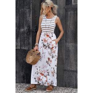 Striped Floral Round Neck Sleeveless Maxi Dress