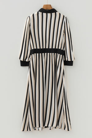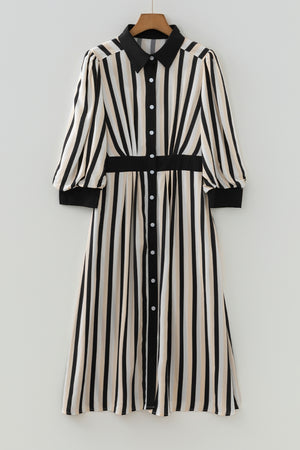 Black Stripe 3/4 Puff Sleeve Shirt Style Button Down Midi Dress