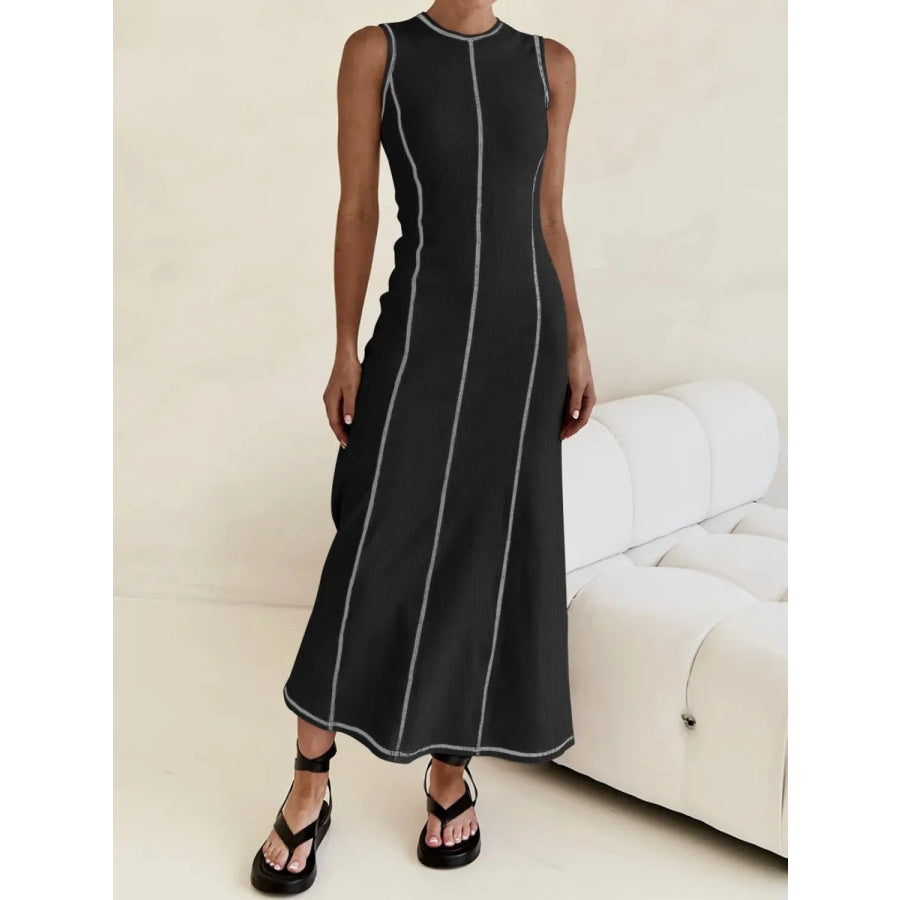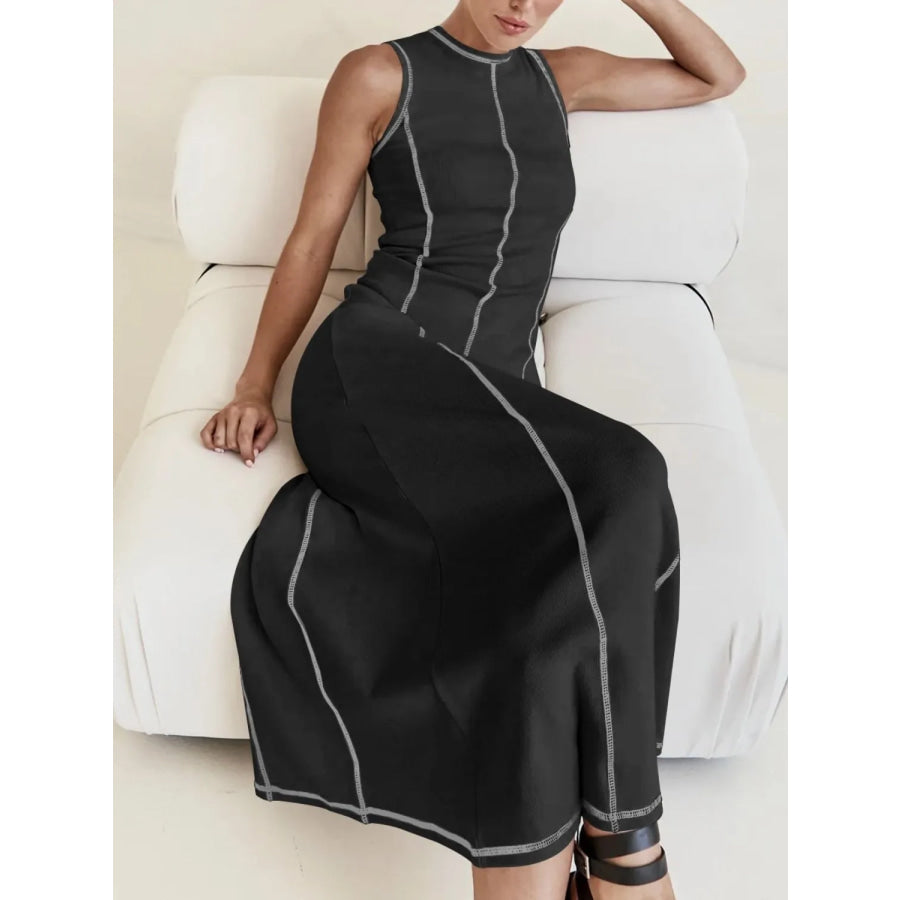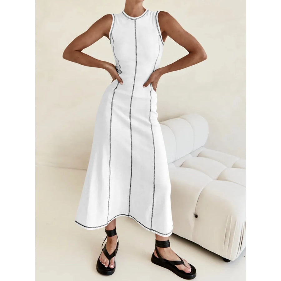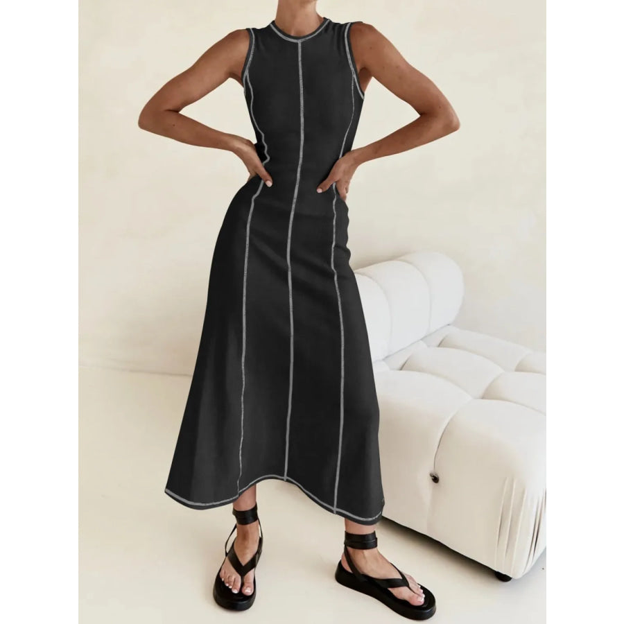 Contrast Stitching Round Neck Sleeveless Midi Dress