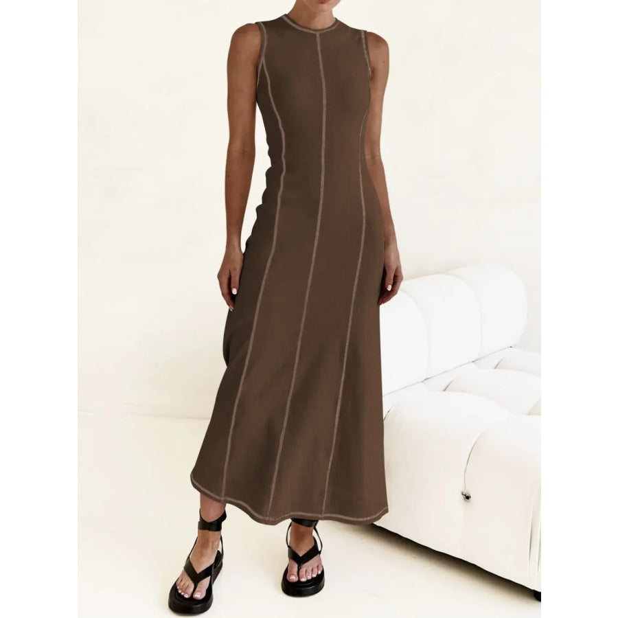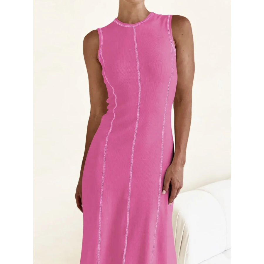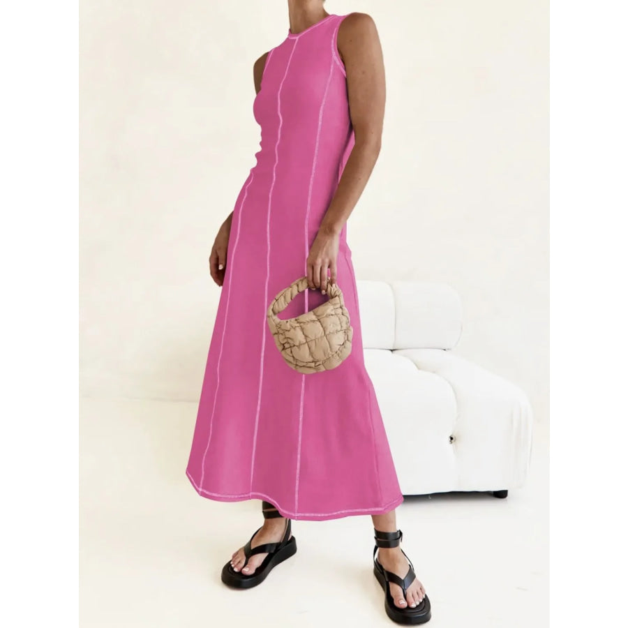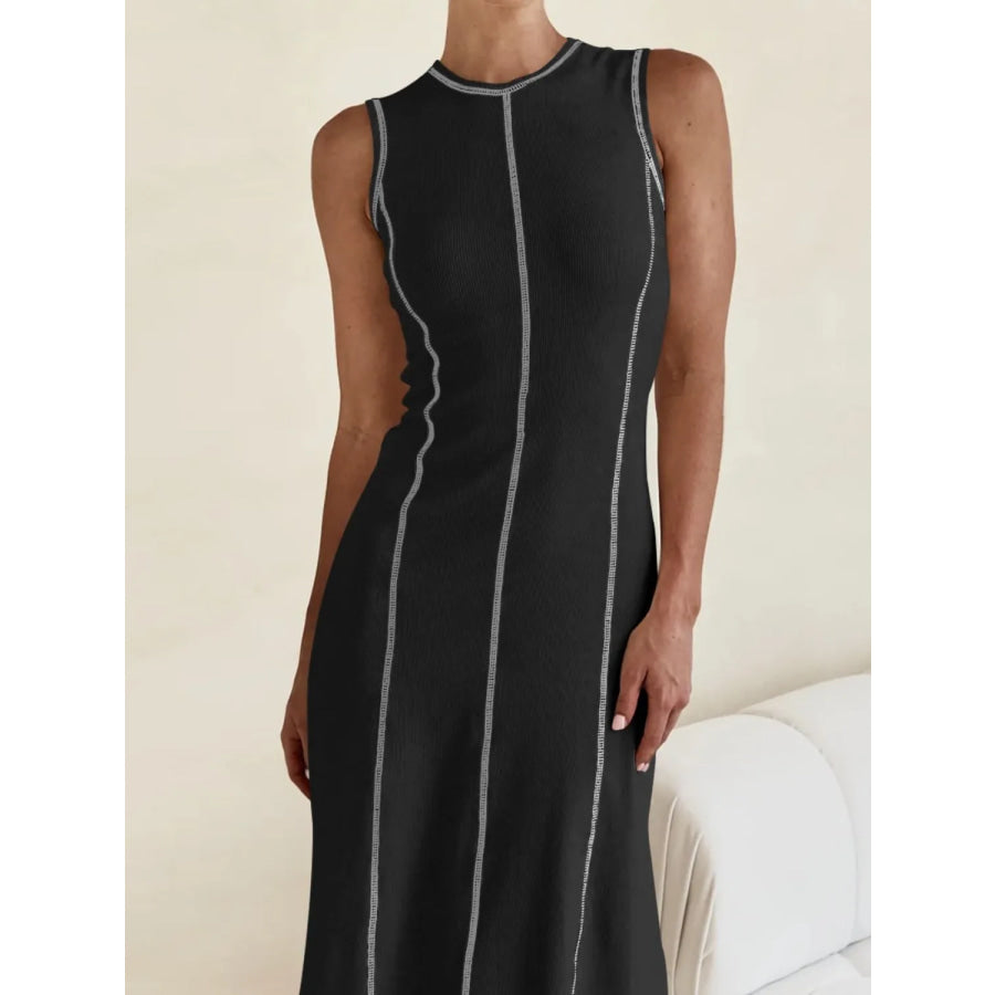 Contrast Stitching Round Neck Sleeveless Midi Dress