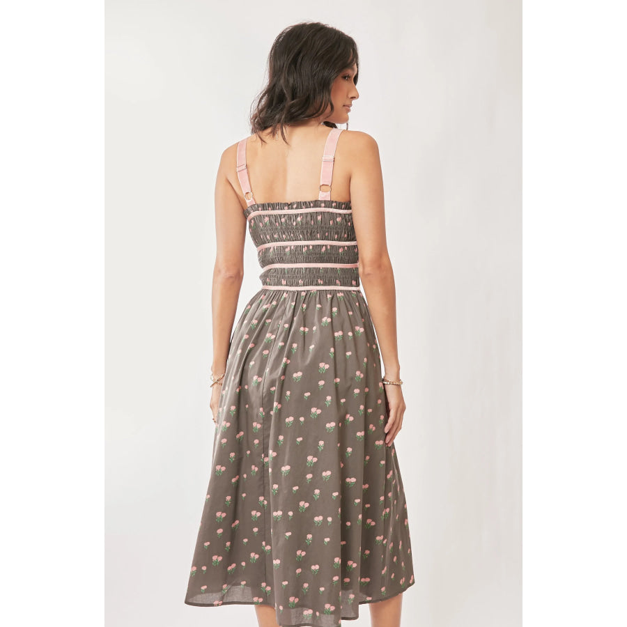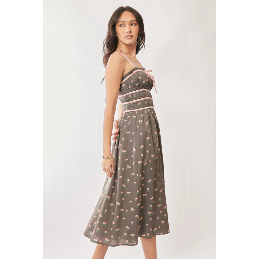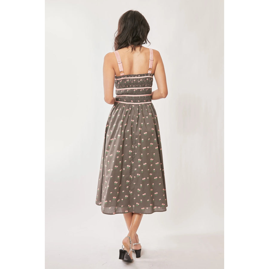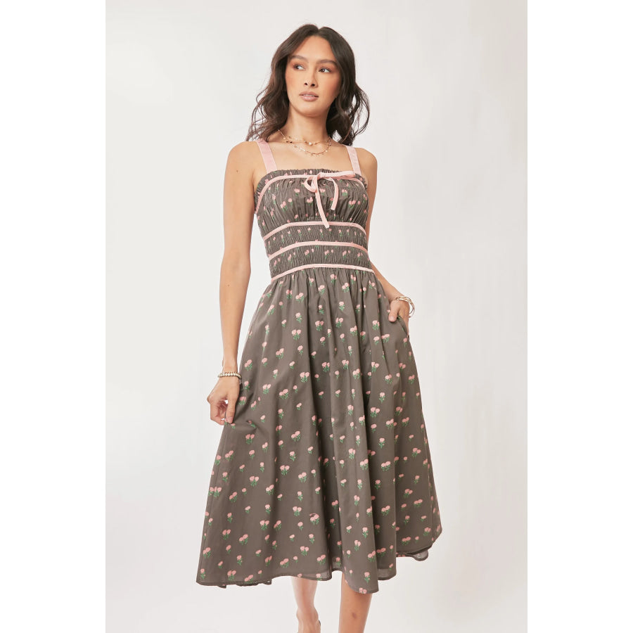 Davi & Dani Contrast Velvet Tape Smocking Bodice Midi Dress
