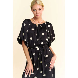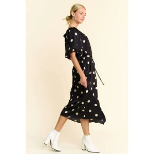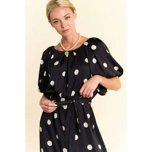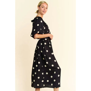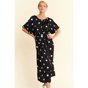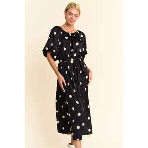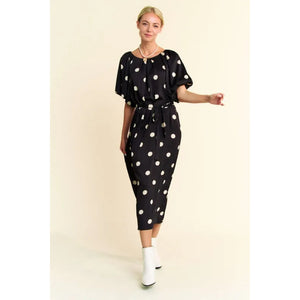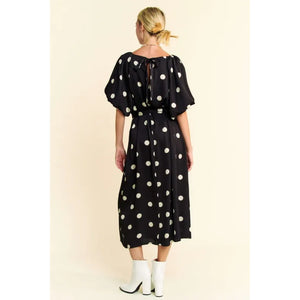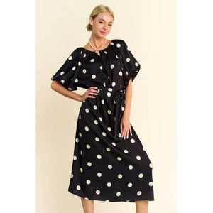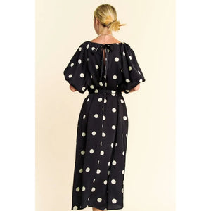 Davi & Dani Polka Dot Puff Sleeves Waist Tie Midi Dress