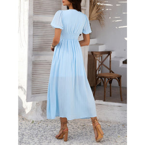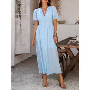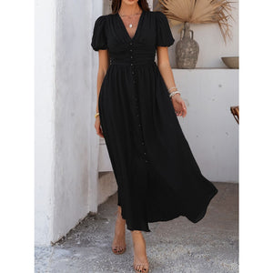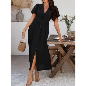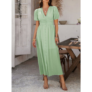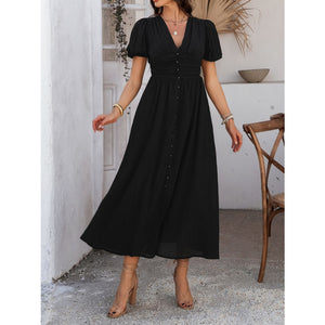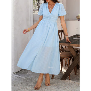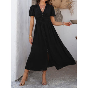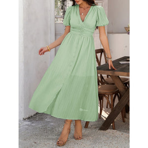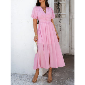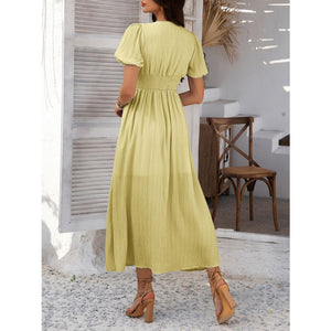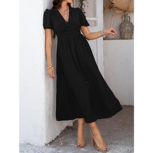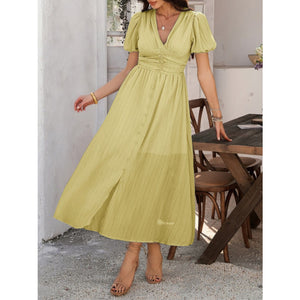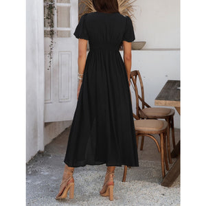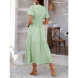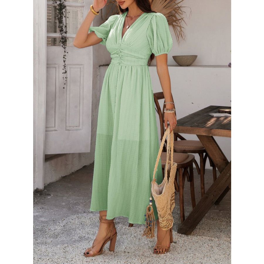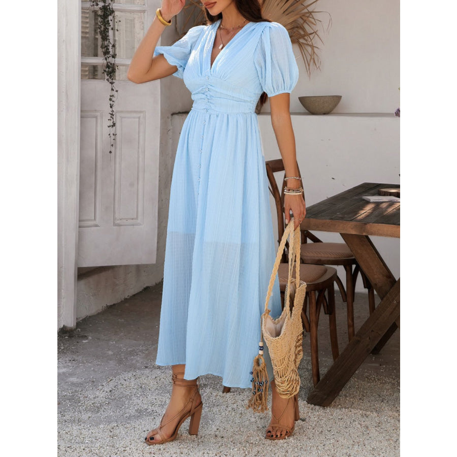 Devine V-Neck Puff Short Sleeve Midi Dress