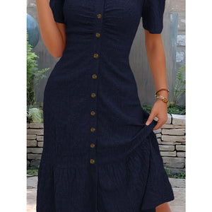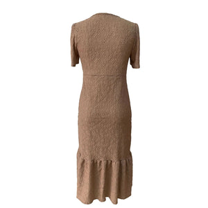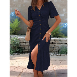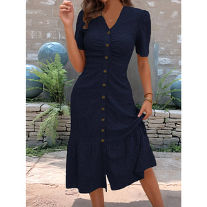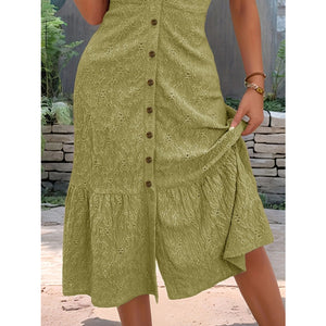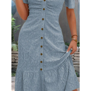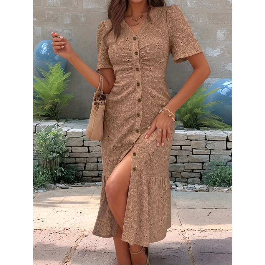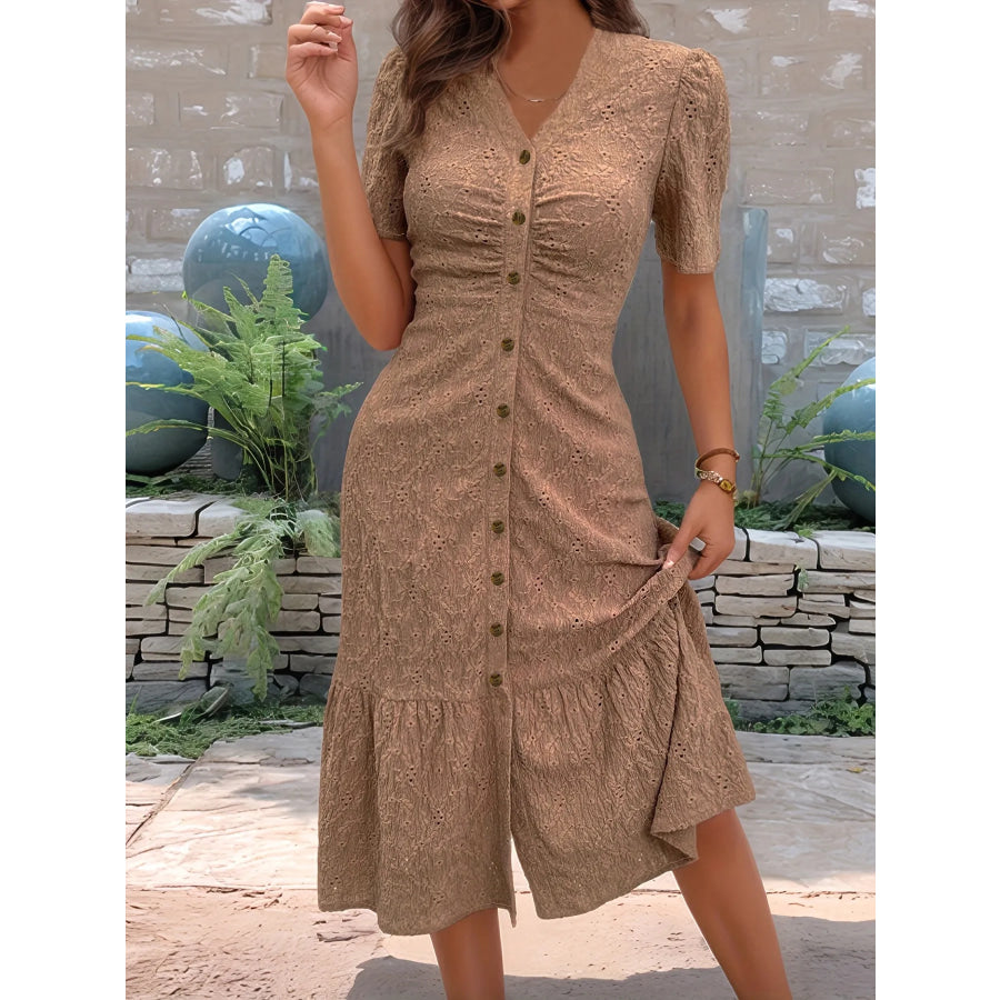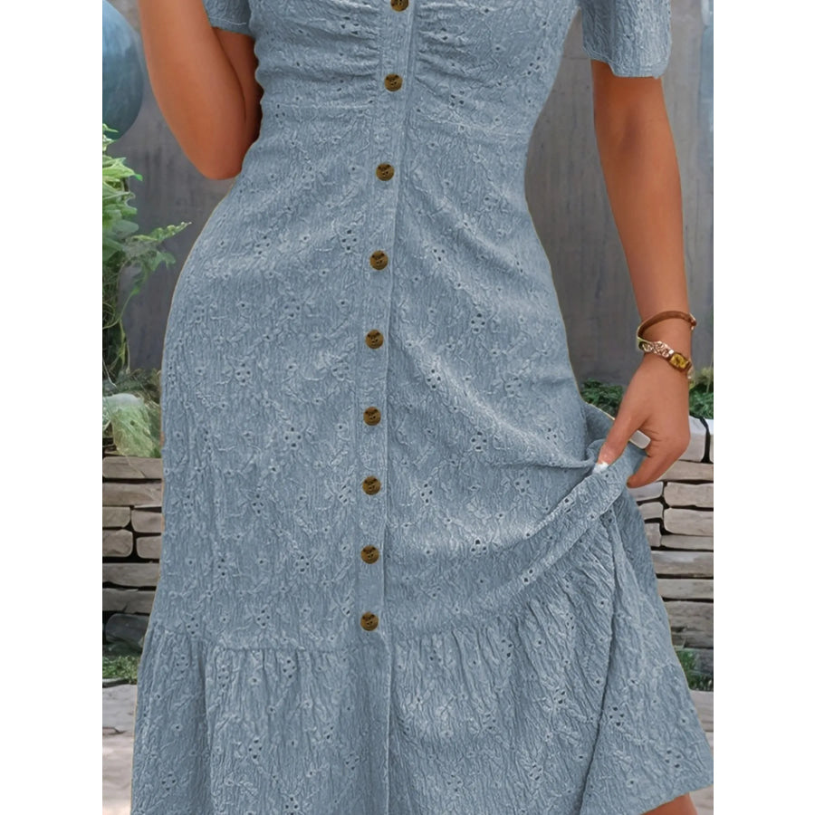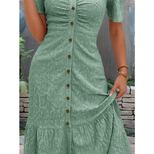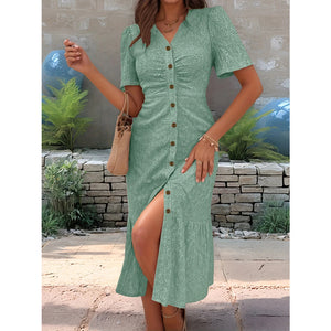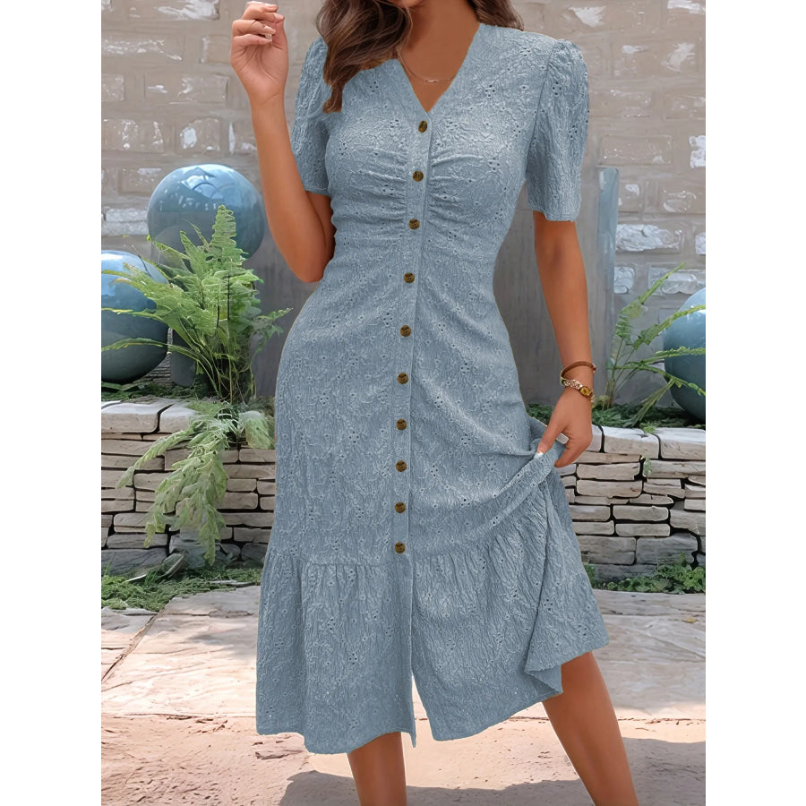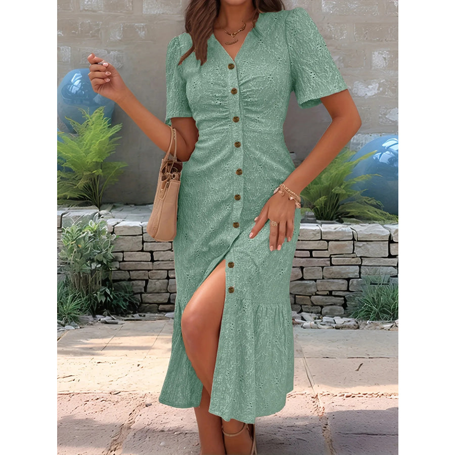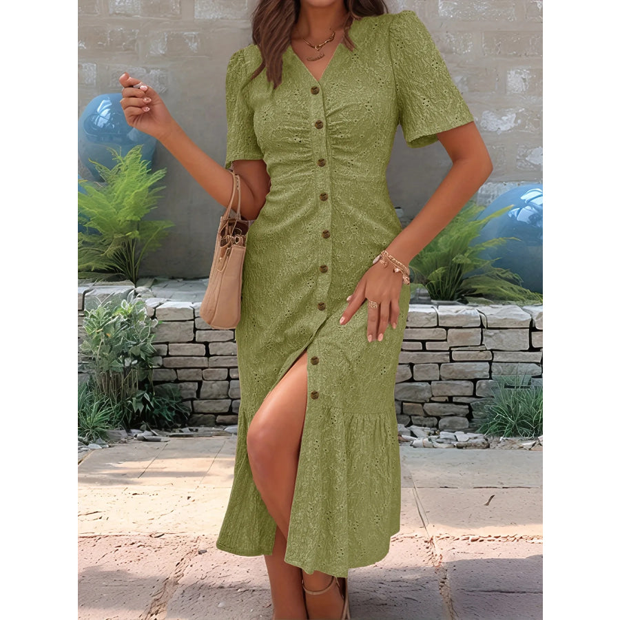This charming midi dress features an all-over eyelet lace pattern in a fresh sage green color. The dress is beautifully constructed with a v-neckline, button-front closure, and short puff sleeves for a romantic touch. The fitted waist creates a flattering silhouette while the flounce hem adds movement and femininity. Made from a breathable cotton blend fabric, this dress is perfect for warm weather occasions. The vintage-inspired design combines classic elements with modern details, making it versatile for both casual and semi-formal events. The intricate eyelet pattern and sage green color create a fresh, romantic look that's ideal for spring and summer wardrobes.