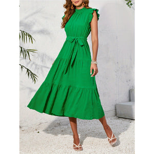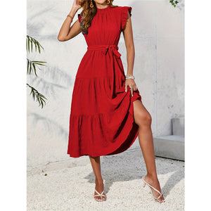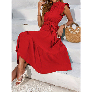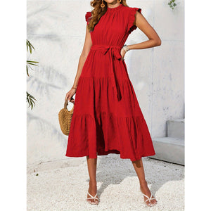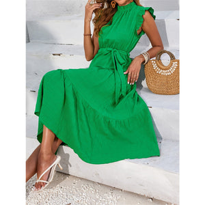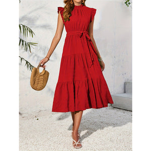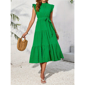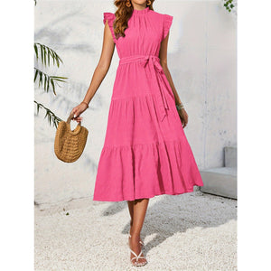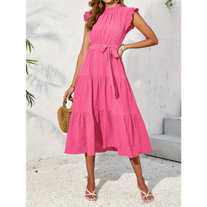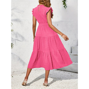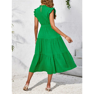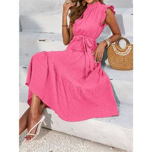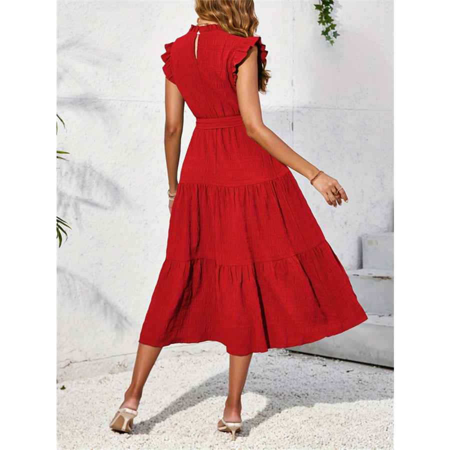 Frill Mock Neck Ruffled Cap Sleeve Midi Dress