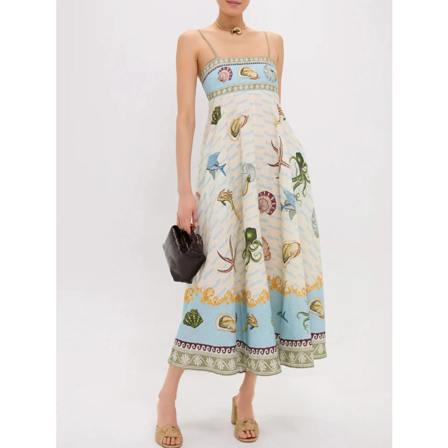 This ocean print midi dress features delicate spaghetti straps and a breezy silhouette, perfect for sunny days and beachside strolls. Its vibrant pattern brings a splash of fun to your wardrobe, while the comfortable fit keeps you feeling light and carefree all day long. Ideal for casual outings or summer parties, this dress effortlessly combines style and comfort.