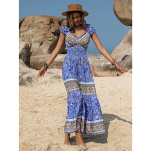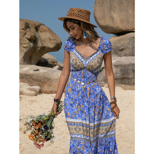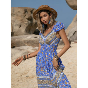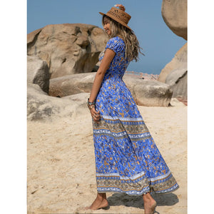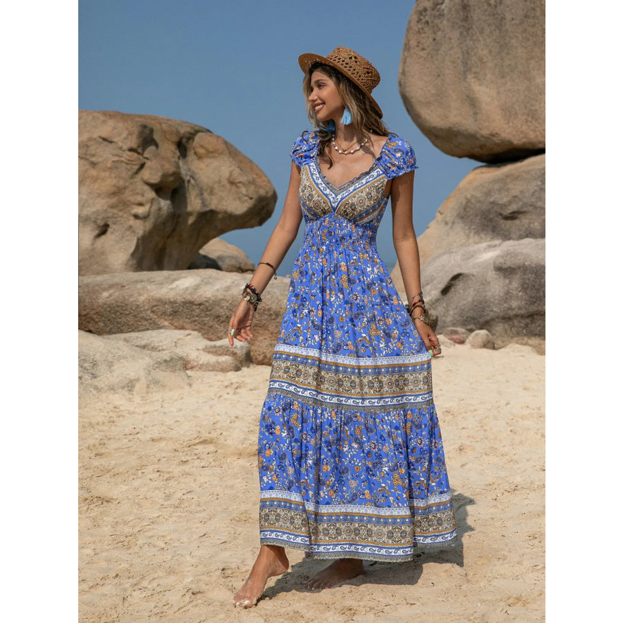 Printed V-Neck Cap Sleeve Midi Dress