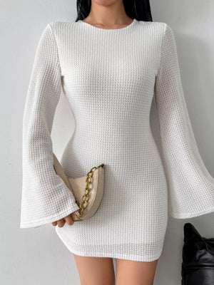 Backless Waffle Knit Flare Sleeve Mini Dress
