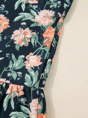 Floral Print Striped Trim V Neck Long Sleeve Ruffle Hem Shift Mini Dress