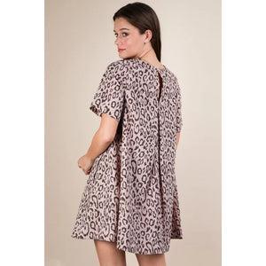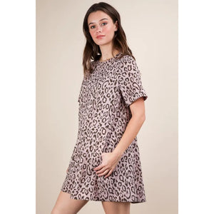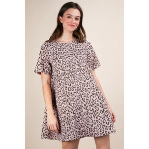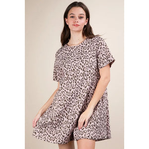 A leopard-printed comfy mini dress is a trendy and comfortable piece with a stylish animal print pattern. This dress combines a fashionable leopard print with a relaxed and easy-to-wear mini-length silhouette. Perfect for both casual outings and adding a touch of flair to your wardrobe, this dress is a versatile and on-trend choice for any fashionista.