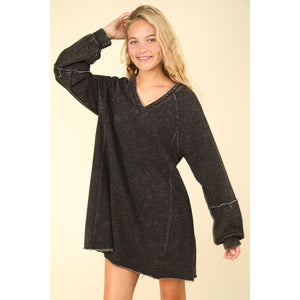The Mineral Washed Oversized A-Line Mini Dress offers a relaxed, stylish look with its v-neck and drop shoulder design. The raglan long sleeves enhance its laid-back vibe, while the raw edge detail adds a touch of casual chic. The mineral-washed fabric gives the dress a vintage, lived-in feel, making it perfect for a comfortable yet fashionable outfit.