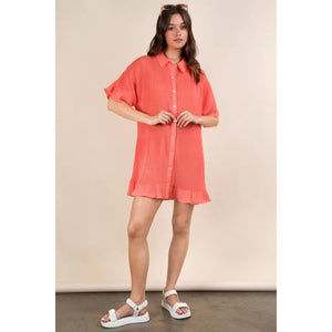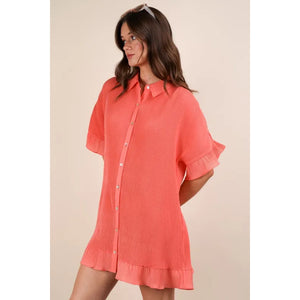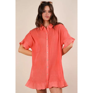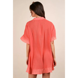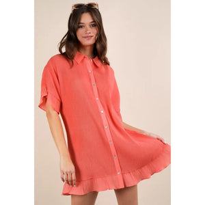 The Pleated Detail Button Down Mini Dress is a stylish and versatile piece for any occasion. Its pleated detailing adds a touch of sophistication, while the button-down design provides a classic look. This dress is perfect for both casual outings and more formal events. The mini length adds a playful vibe, making it easy to dress up or down. With its comfortable fit and flattering silhouette, this dress is sure to become a wardrobe favorite. Add some accessories and you're ready to turn heads wherever you go!