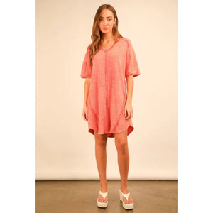 A mineral washed ribbed knit mini dress offers a trendy and stylish look. The ribbed knit fabric adds texture and comfort to the dress. The mineral wash treatment gives it a unique, slightly worn-in appearance. Perfect for a casual yet fashionable outfit.