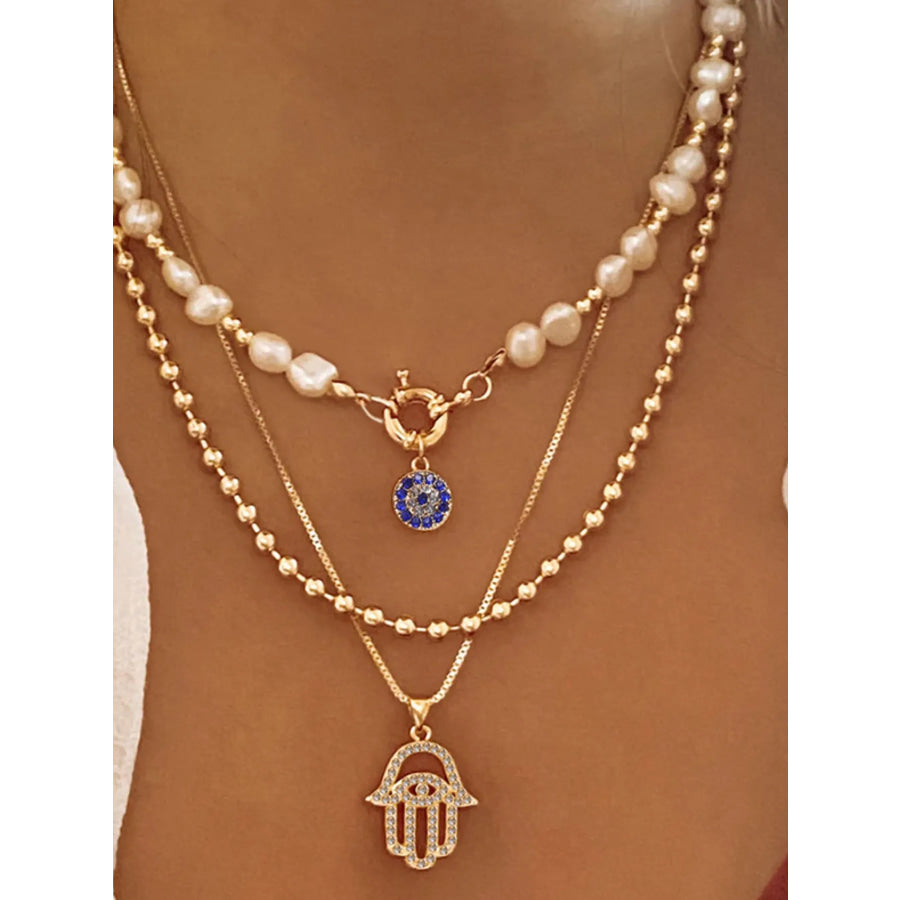 Layered Pearl Chain Evil Eye Hamsa Pendant Necklace