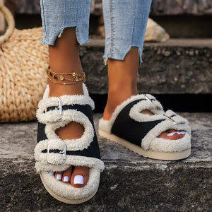 Buckle Decor Plush Lined Platform Slippers