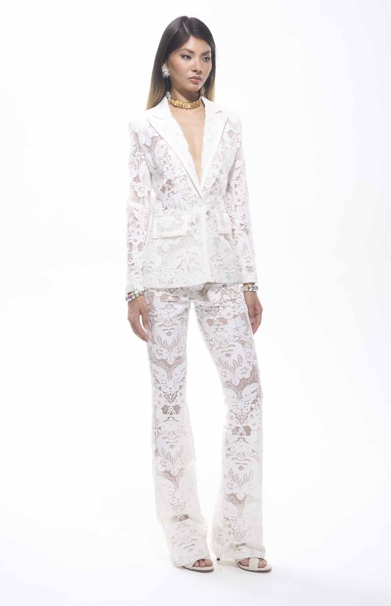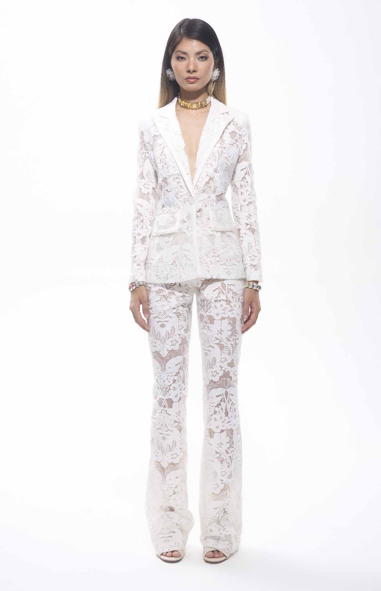 White floral lace blazer with deep V-neckline, notched lapels, front flap pockets, high-waisted wide-leg pants, intricate sheer detailing, high-quality, perfect match for upscale occasions like galas, weddings, or resort parties.