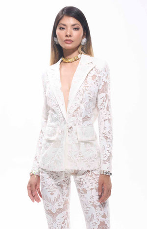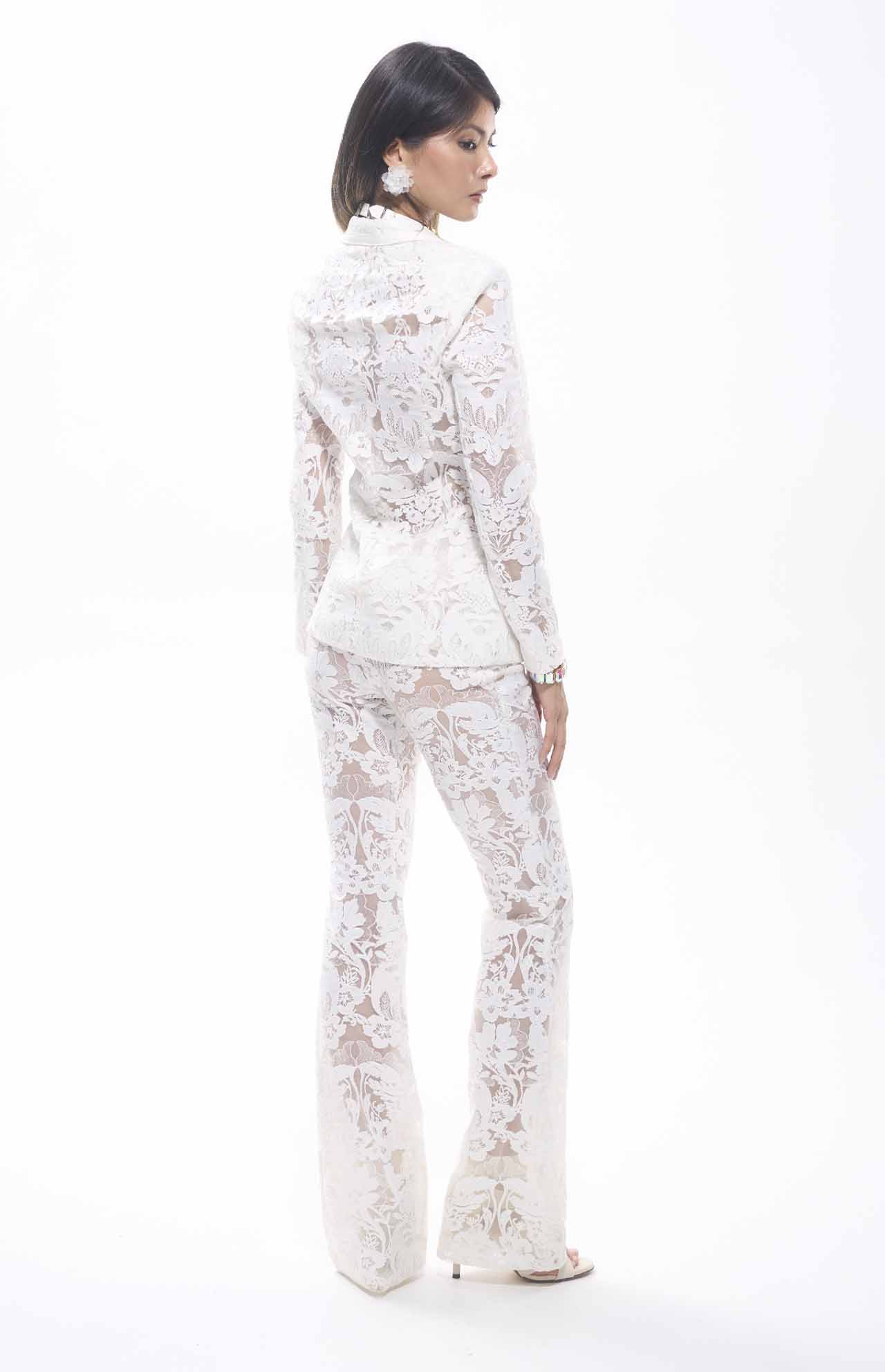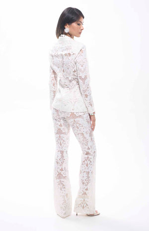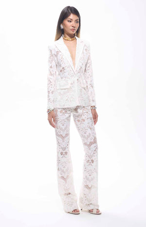 A luxurious two-piece ensemble in white. The set includes a tailored blazer with a deep V-neckline, notched lapels, and front flap pockets, paired with high-waisted, wide-leg pants, both crafted from intricate floral lace with sheer detailing. Designed for upscale occasions like galas, weddings, or resort parties, this high-quality set ensures a perfect match, blending elegance and modernity for a standout look.