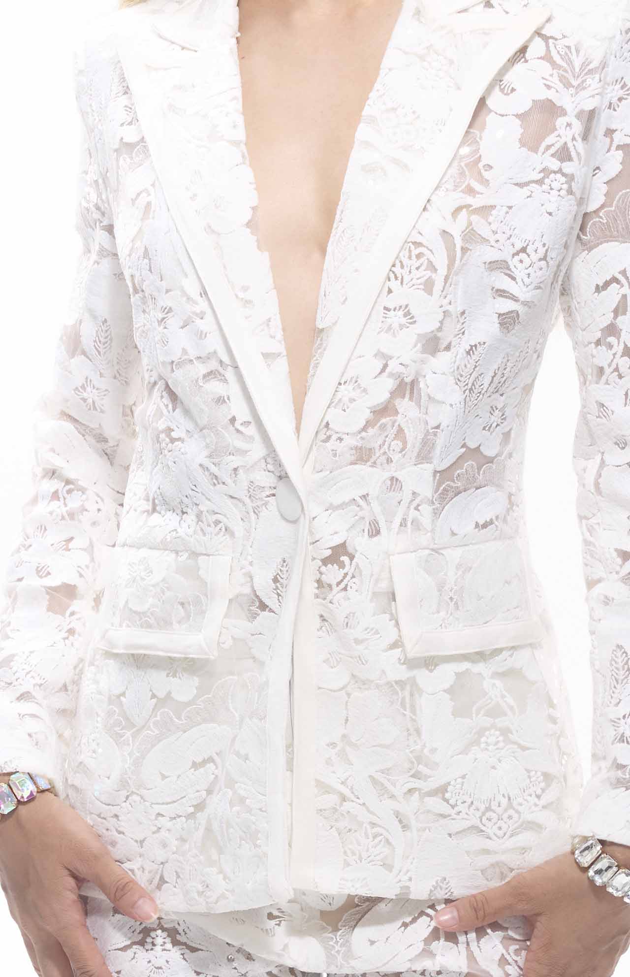 The GUZUNDSTRAUS brand Carie Sequin Floral Lace Set features a white floral lace blazer and matching pants with intricate sheer detailing. Perfect for upscale events, this high-quality set offers a perfect match for a sophisticated, elegant look.