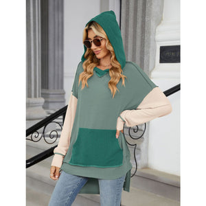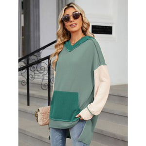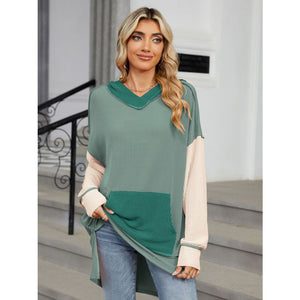 Double Take Contrast Hooded Long Sleeve Top