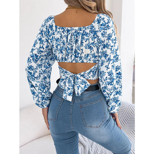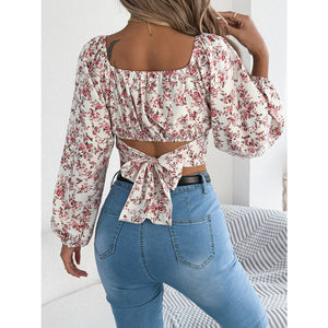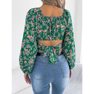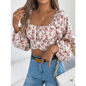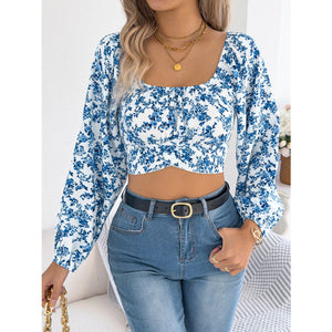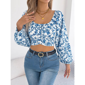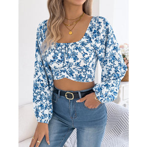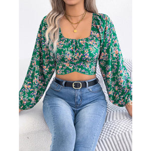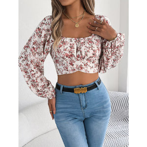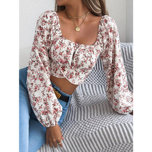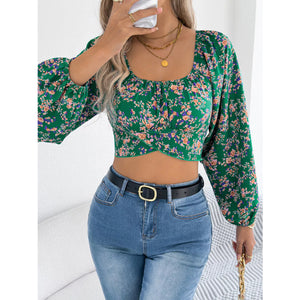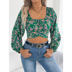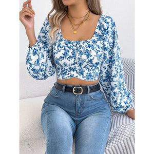 Floral Balloon Sleeve Square Neck Crop Blouse