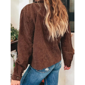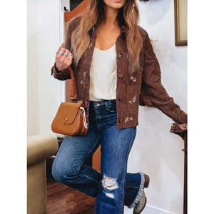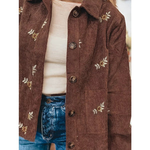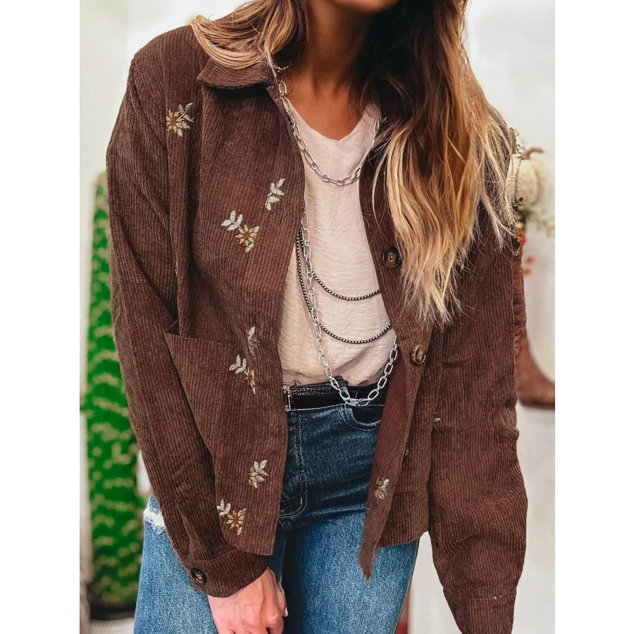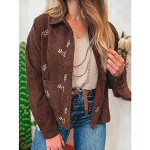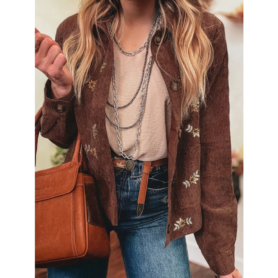 Floral Embroidered Collar Button Front Corduroy Jacket