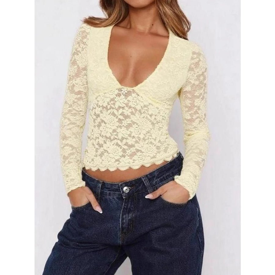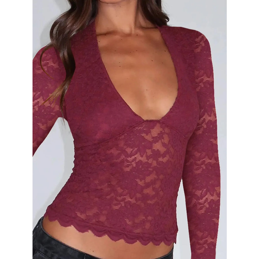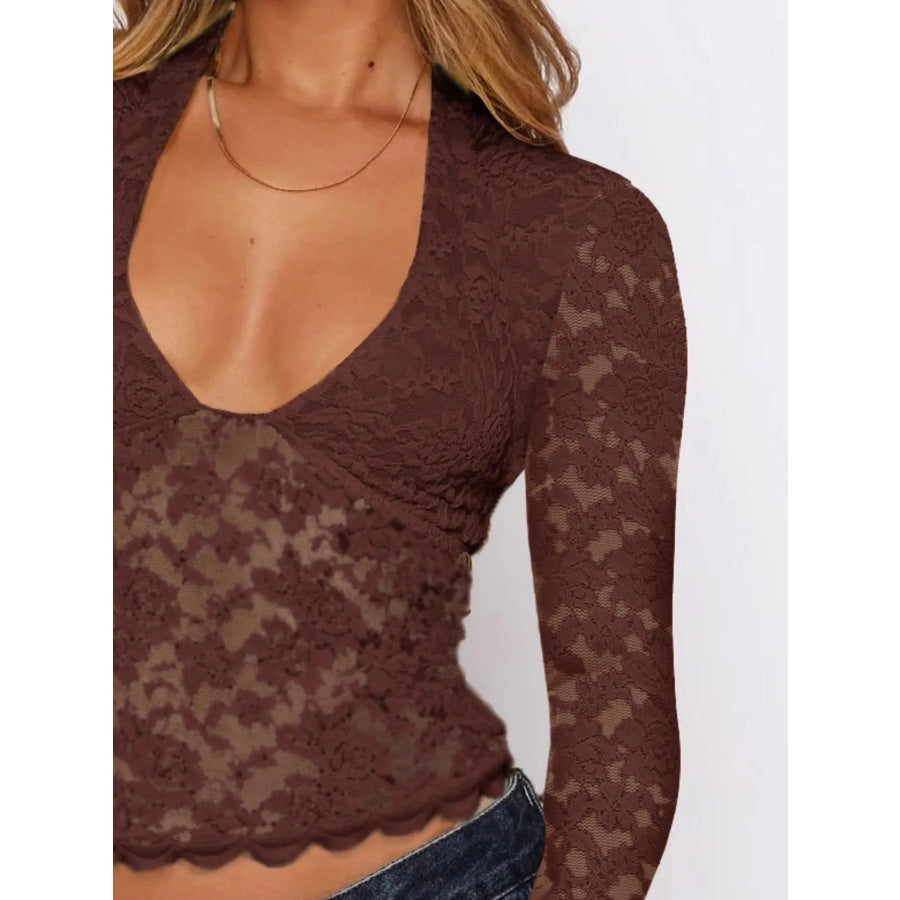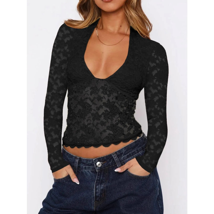Floral Lace Long Sleeve Deep V-Neck Blouse with Scalloped Hem