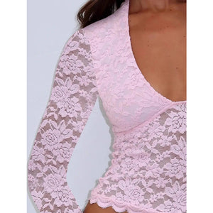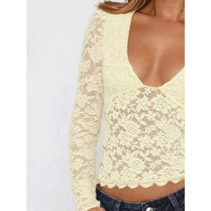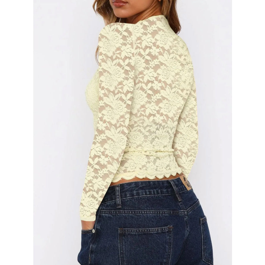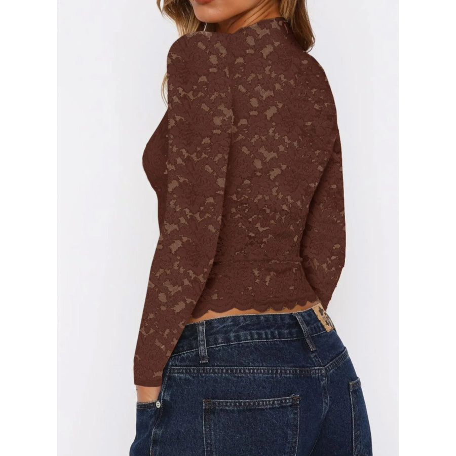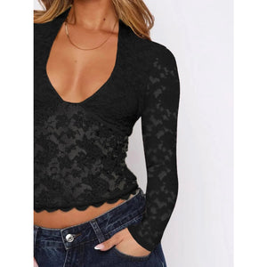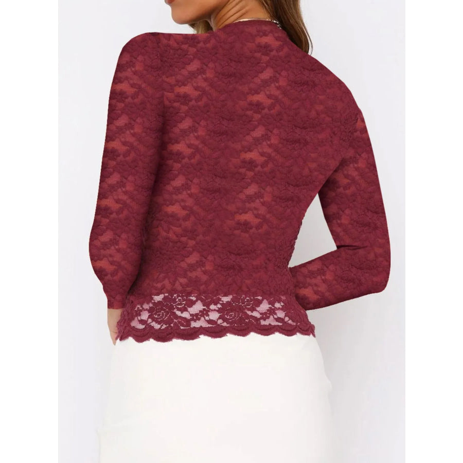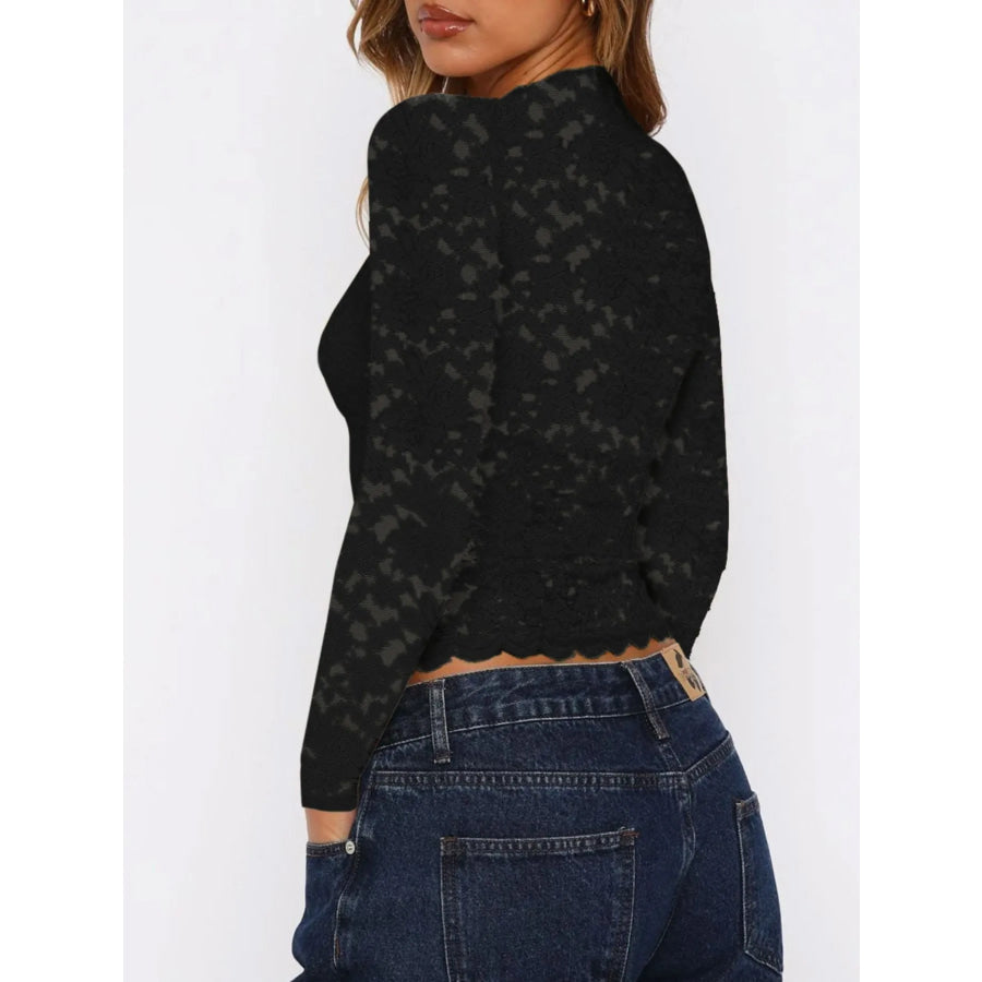 Floral Lace Long Sleeve Deep V-Neck Blouse with Scalloped Hem